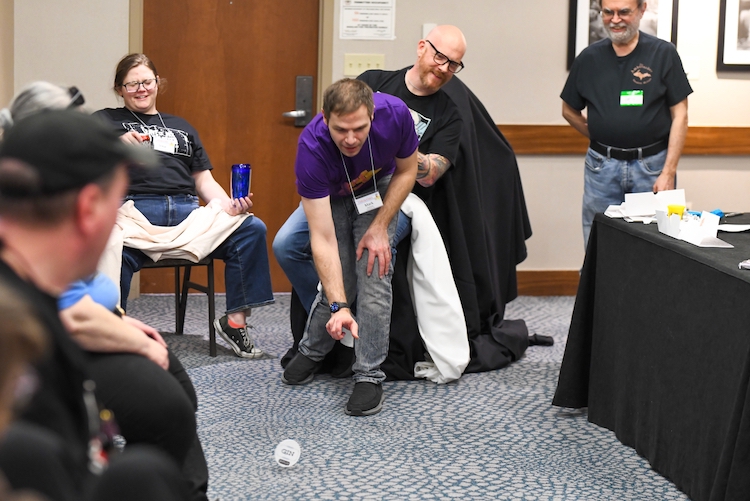 contestant Mark aiming to win while sitting on Casey's lap.
